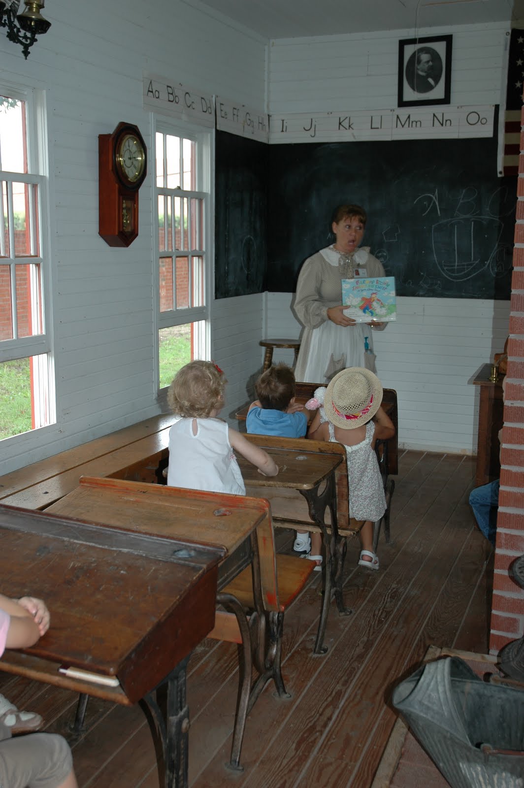The program started in the little one room red school house. ย It is an authentic school house from the period so there are open windows for ventilation. ย There is an old stove in the middle of the room which would have provided heat for the room on cold days.