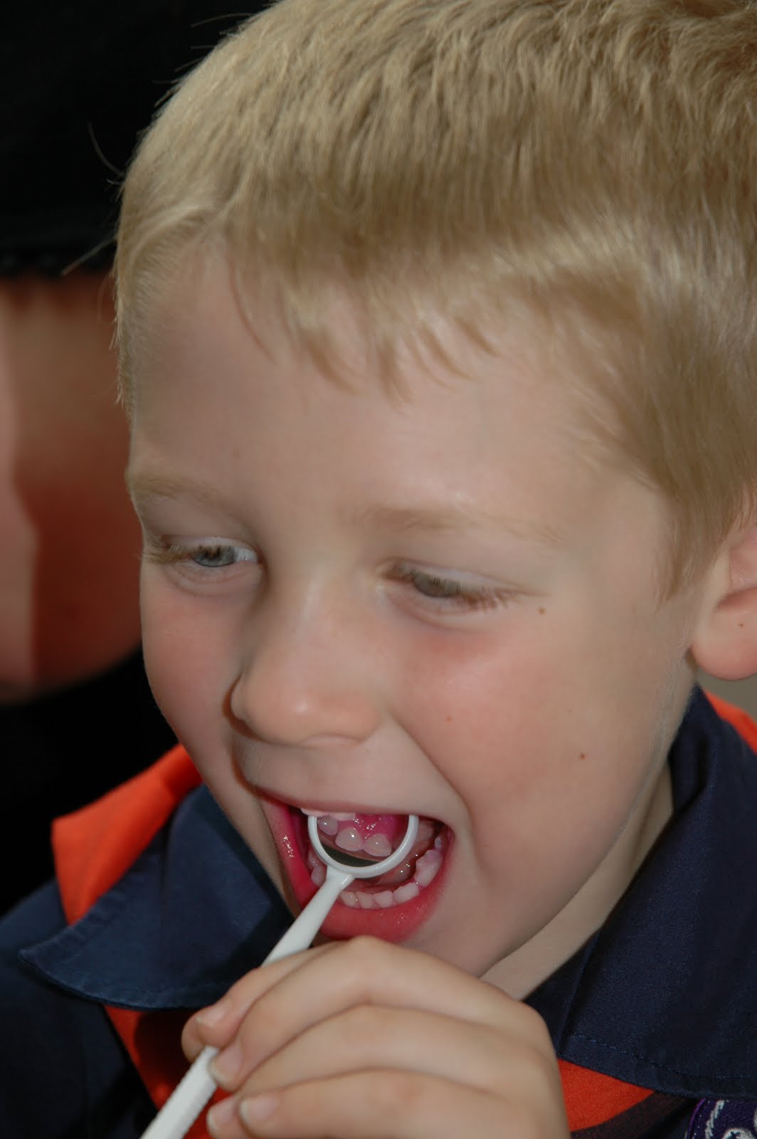 Jamie gave all the boys their own little dental mirror to keep. Nicholas quickly figured out how to use it with another mirror to see behind his front teeth.