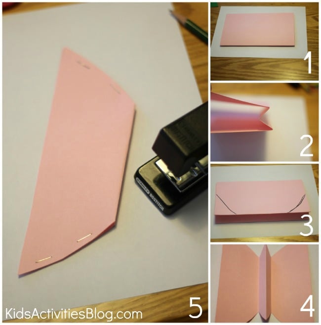 - Fold the paper to make an M (center fold inward and then two folded humps on either side.