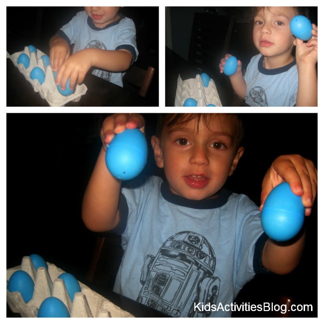 The next day, I presented a carton of blue shaky eggs to my son. I explained how the matching game works: each of these eggs had something inside and the object of the game was to find the matches. Since he has played matching games like Memory before, he knew that he was supposed to return the eggs to their spot after each turn.