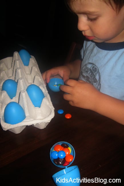 My son then asked me if he could look inside each of the eggs. So, we opened them up and poured the contents of each egg onto our table. Somehow, the contents of the M&M eggs mysteriously disappeared.