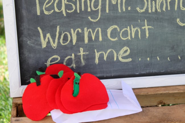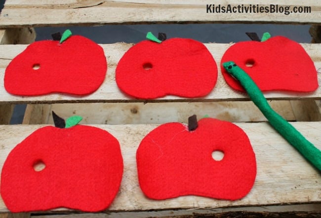 You will need to trace 5 apples onto felt and make a small hole in each of them so Mr. Worm can go through each one as he crunches on them. ย To make the worm you will need to roll up some green felt and hand sew a quick stitch on the side of it and glue eyes with piece of black felt or googly eyes.