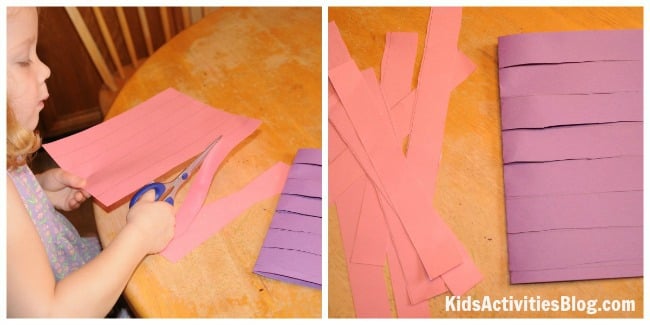 Then she opened up the purple paper. She loved discovering the neat slits she had made on the paper. I showed her how to weave the pink strips of paper through the purple paper by alternating them over and under. Repeat by using the opposite over and under pattern with the next pink strip of paper to get a true weave effect.