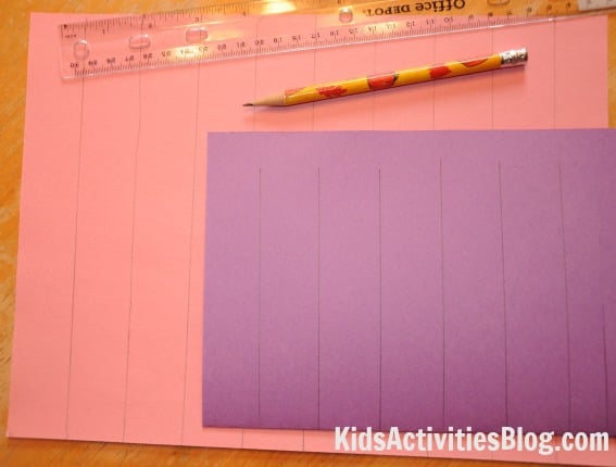 My daughter loves pink and purple so her color choice was obvious. We started with the pink paper and I showed her how to line up the ruler and draw straight lines across the page. This was a new skill for her and she was very excited about doing this for the entire page. For the purple paper, we folded it in half and again used the ruler to help draw straight lines from the fold to about half an inch or so from the edge.