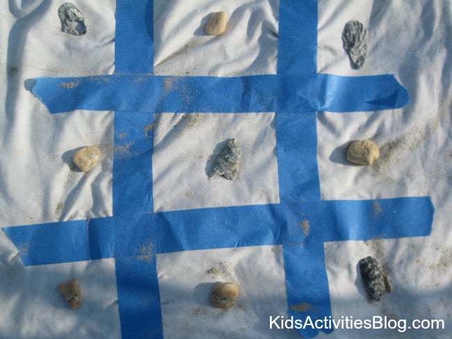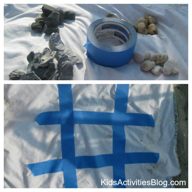 I used the painter’s tape to create a Tic Tac Toe board (which looks like a hash tag) right on our beach blanket.