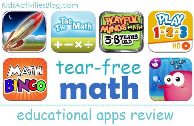 Rocket Math is a scalable math program.   Awesome for math homework practice.   It covers 1-4th grade material and includes some spatial reasoning “missions”.   Definitely worth the 99 cents!!   This educational app gets 5 stars from us on value and engagement. Are you working with your kids on a specific skill?   Like adding numbers to 2 or easy division problems??   This is a great math app for kids in 1st to 5th grade – it has a wide range of problems and helps your kids practice and drill skills that they need to work on.   This app gets 4 stars for information covered (and three for engagement).   It was my favorite math app for my kids, NOT theirs. Looking for free??   Playful Minds has a math subscription.   You can play math games for free and as your child solves math problems they earn points to unlock new levels, or if you want more control over what they are working on, you can get a yearly subscription (i.e. pay a fee).   The lessons build on each other and seemed to hold my child’s attention.   This app gets five stars for value! Starting with your child at the beginning?   Not looking for division, and wanting to keep your preschooler engaged – Play123 is a simple, FREE educational app that helps your preschooler learn shapes, colors, patterns and counting with bright colorful shapes. Kids can practice what they’ve learned with this Math Bingo Game.   It is only 99 cents and covers addition, subtraction, multiplication, and division.   Each “game” is laid out in a grid and to “win” you have to solve the answers to make “bingo”. Fish School is an app for preschoolers to help them recognize patterns and number correspondence.   It is a favorite of my 3 year old! .
