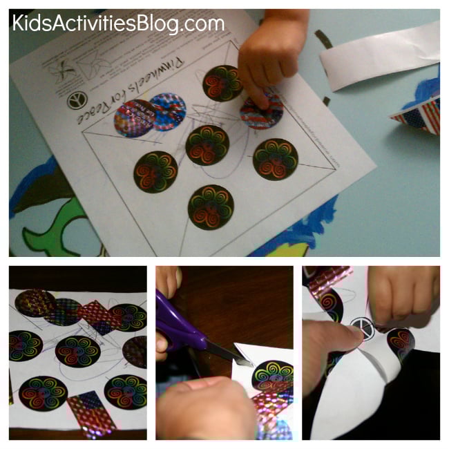 We had a little difficulty figuring out exactly how to assemble the pinwheel but finally got it. As per the instructions, we pulled every other corner into the center, placed the peace sign (over the points) in the middle and then secured the shape by sticking a straight pin through the gathered edges. We then put the straight pin into the eraser of a pencil, angled it, and took it for a test drive. It spun!