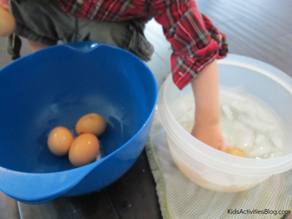 Making sure my son was closely watching, I slowly transferred the hot eggs into the ice bath. He quickly began to explore the ice water and the eggs.