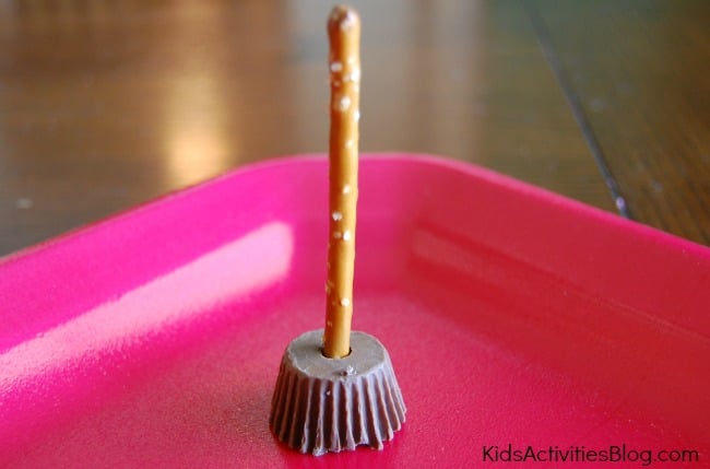 Place a plain pretzel stick into the bottom of a peanut butter cup.