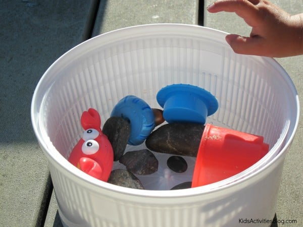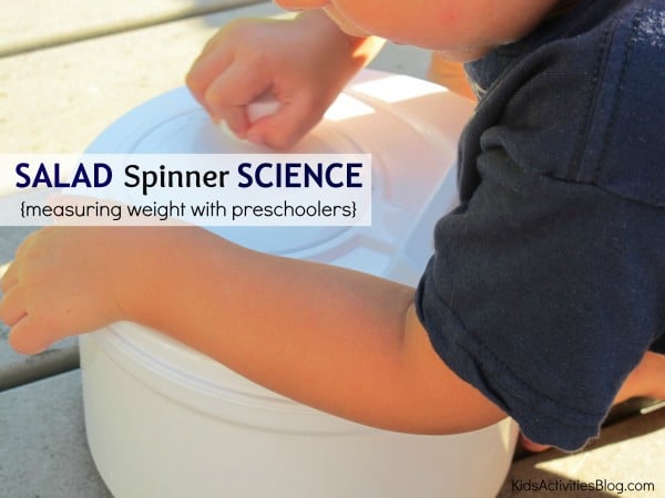 A few weeks ago I noticed him exploring our salad spinner. He began to put rocks and various other items in the salad spinner and, with great care and curiosity, he began to add and take away objects of different sizes (and weights). He noticed that it “was tough” to push the spinner and make it go around when there was more weight in the spinner. He also noticed how the spinner became full with the lighter objects but it was still easy to push and spin, but only a few rocks made the spinner tough to get going.