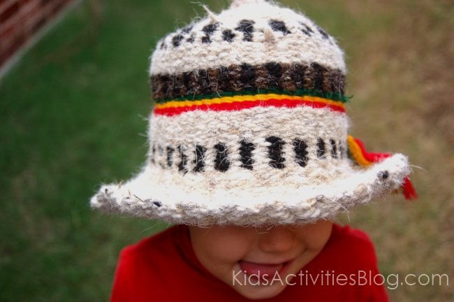 Now that we are home, I am teaching my son how to weave. We aren't making hats, just practicing with bits of yarn, maybe the finished product can become a coaster for our Ethiopian coffee pot. To make our loom, we used a plastic storage bin, wrapped yarn around it until the section was as wide as we were going to work with. Then we taped the back to keep the strings secure. With bits of yarn, we threaded them through the loom. This is a great activity to help your kids practice fine motor skills, or work on recognizing patterns.