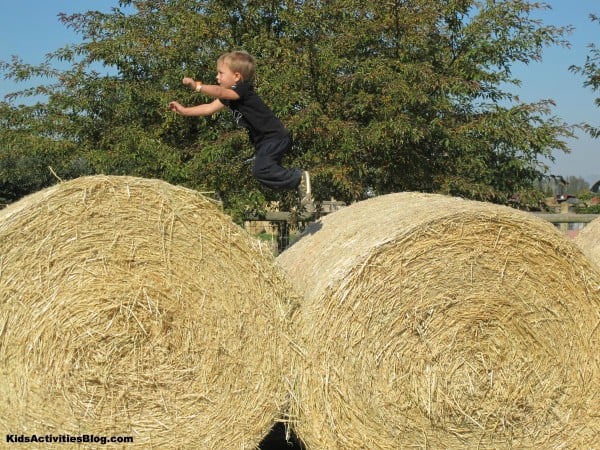 My boys favorite farm activity was the Corn Kernal Sensory House. Yes, you read correctly, an entire open air room filled with corn kernals. What an amazing sensory experience. We went barefoot and closed our eyes to fully experience the wonder. Can’t make it to the farm? Fill a bin at home with corn kernals purchased from your local grocery store. Add a few farm figurines and cups for scooping and you have your Farm Sensory Tub!Then we ventured to the hay stacks for climbing and jumping. There were these amazing slides and a hay maze for the kids to explore. Recreating this activity can be done by a trip to your local playground or by organizing an obstacle course in your living room or back yard!