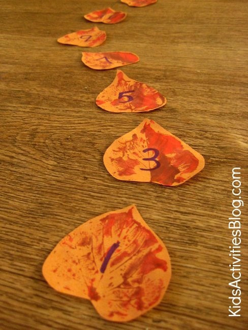 We are all about leaves in our house right now, especially jumping in great big piles of them in the garden! I have two lively children who love active play, so when it comes to learning I try to find as many ways to make it playful as I can. We had lots of leaf prints left over from making fall leaf wreaths, so I’ve combined them with some number games so my girls can enjoy moving around and playing some full body math games.