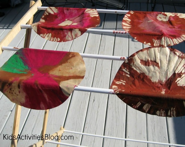 - When we had created several coffee filter works of art, we set them out to dry on a clothes drying rack.