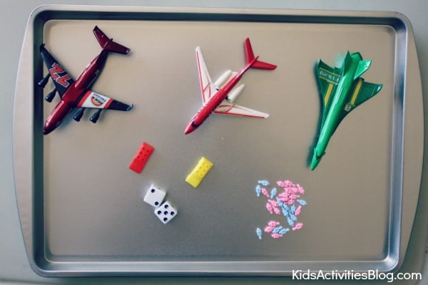 For this activity, Bear (4 yrs) and I each had our own color car for our “passengers” (Life people) to ride to the airport in. We each rolled one of the dice and placed the corresponding amount of “passengers” into our cars. Then we “drove” them to around the table and to the airport so they could go on a trip. Whoever got the highest number on the dice they rolled got to pick the plane.