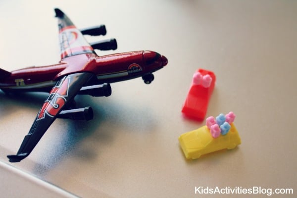 For this activity, Bear (4 yrs) and I each had our own color car for our “passengers” (Life people) to ride to the airport in. We each rolled one of the dice and placed the corresponding amount of “passengers” into our cars. Then we “drove” them to around the table and to the airport so they could go on a trip. Whoever got the highest number on the dice they rolled got to pick the plane.