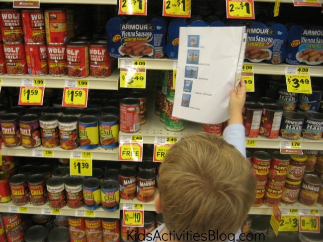 We recently went back to the store for  another hunt and gathering trip for the food bank. JDaniel was able to walk up and down the aisles with me carrying his food bank shopping list. He could hold up the list to the shelves and make sure we were selecting the right items to put into our cart.  Having a picture list really helped him find what we needed and helped keep him focused on the task at hand.