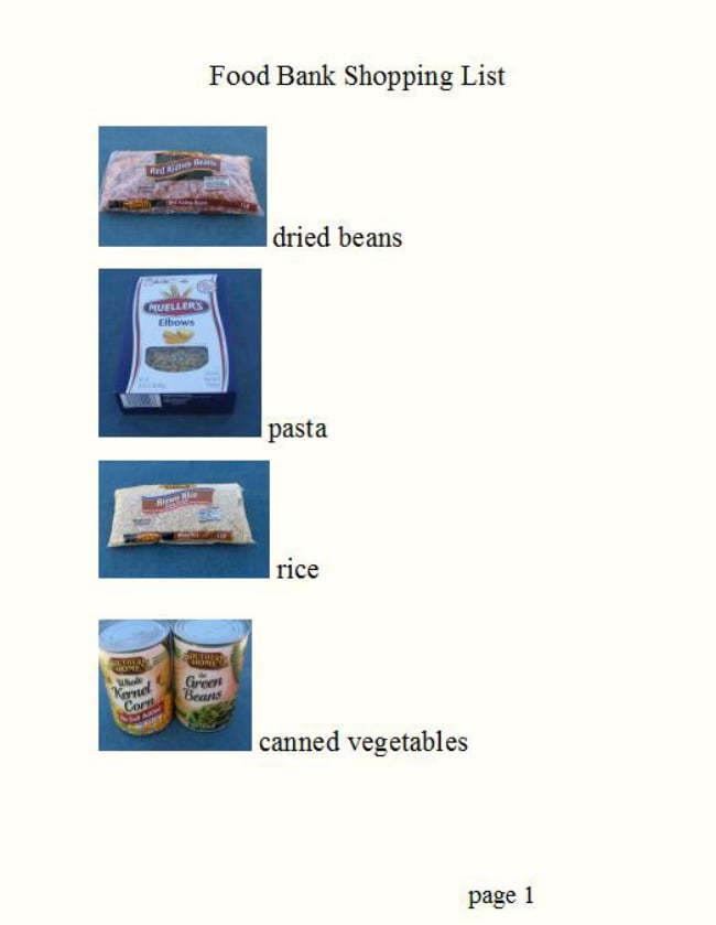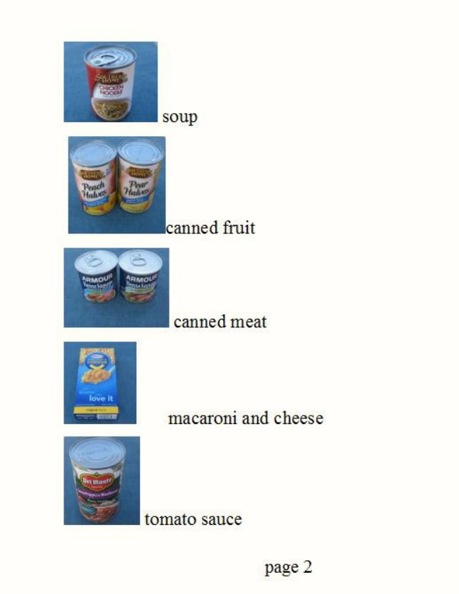 After our last  hunt and gathering session at our local grocery store for foods on the food banks list, I decided to take pictures of the items we had purchase.  The pictures were then edited and placed into a word processing document. I had JDaniel sit beside me and tell me what each item was and then I  typed the words for each food beside their picture. We then printed out the list and put it in a plastic sleeve to keep it from getting torn.