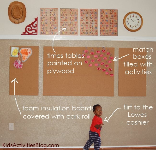 We have a long wall in our school room with nothing on it… time to fill the wall with bulletin boards. They are the perfect backdrop to hang our matchboxes of activities.
