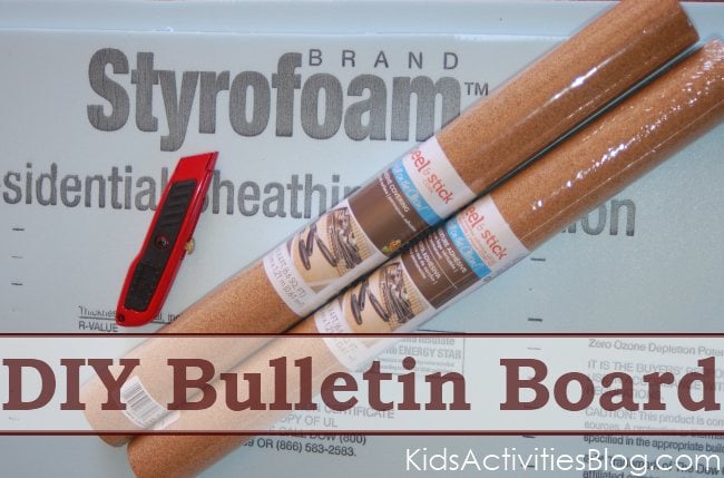 We used a razor blade to cut the Styrofoam sheets into the sizes that we wanted. The cork roll that is available at Lowes is the kind that is sticky on the back. I was pleasantly surprised at how easy it was to affix the cork to the Styrofoam!