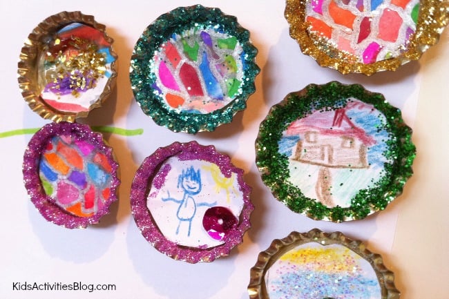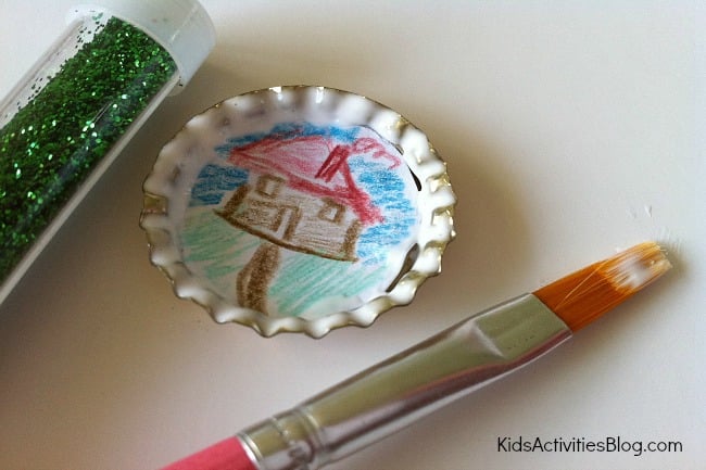 NOTE: If you don’t have any recycled bottle tops, they can be purchased from craft and hardware stores.