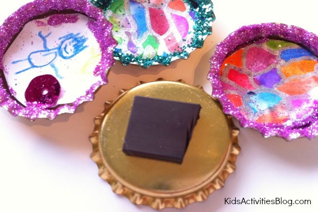 Once the glue and glitter are set, turn the bottle tops over and apply a magnet.
