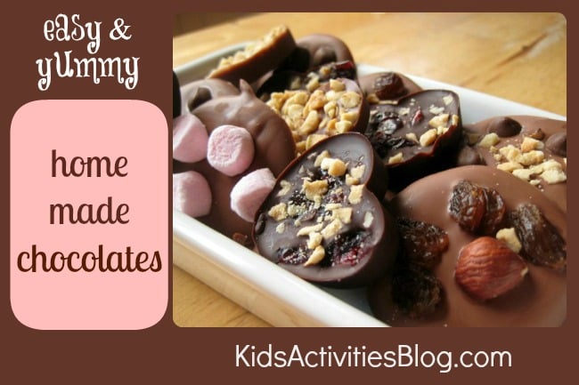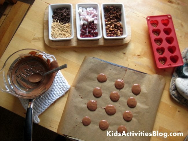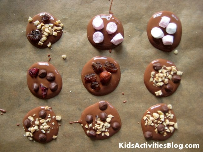- We like to set up a pick-and-mix station with a selection of toppings, so each child can choose the flavors they or the recipient like best. Toppings you might include are chopped candied/glazed cherries, chopped nuts such as pistachios and hazelnuts, chocolate chips, mini marshmallows, raisins, cranberries, candied peel, and sugar sprinkles. Adults might like the addition of chili flakes or sea salt (yes, really!) Drop a few toppings onto each little chocolate and you’re done.