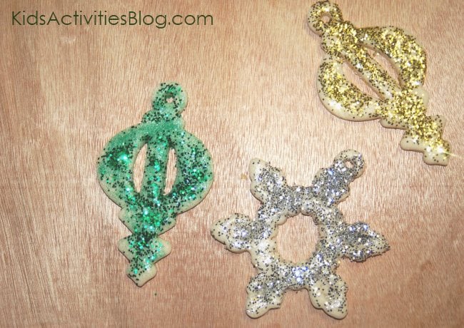 I made the salt dough into ornaments this week and the recipe worked really well! Thanks! I used extra fine gold glitter and metal stamps to personalize them. Here they are, hung on my tree: http://mamaartcollective.wordpress.com/2013/12/19/glitter-workshop/