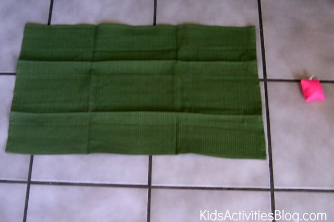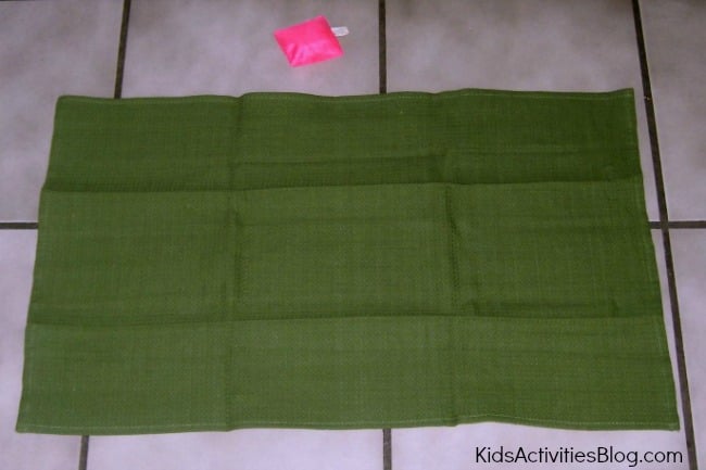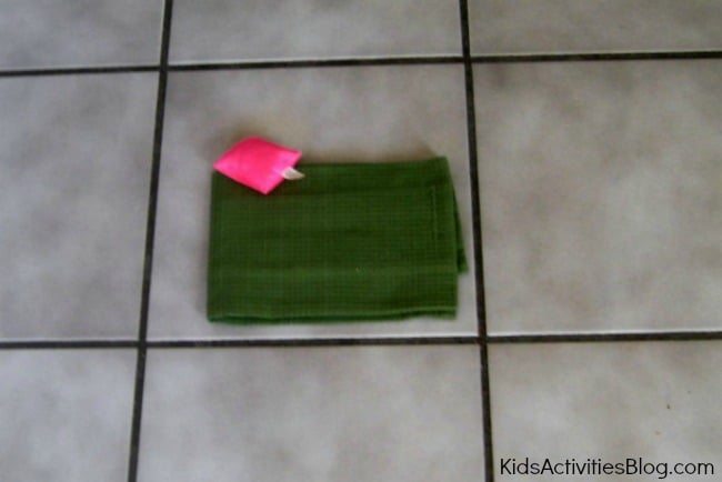 Whether you have children that are “bored” at the end of the day or tired of being inside due to bad weather, a simple dish towel and a bean bag can become a fun activity for them to do. Truly that is all you need to play this simple game that helps children work on gross or large motor skills. ย It also helps them with prepositions too.