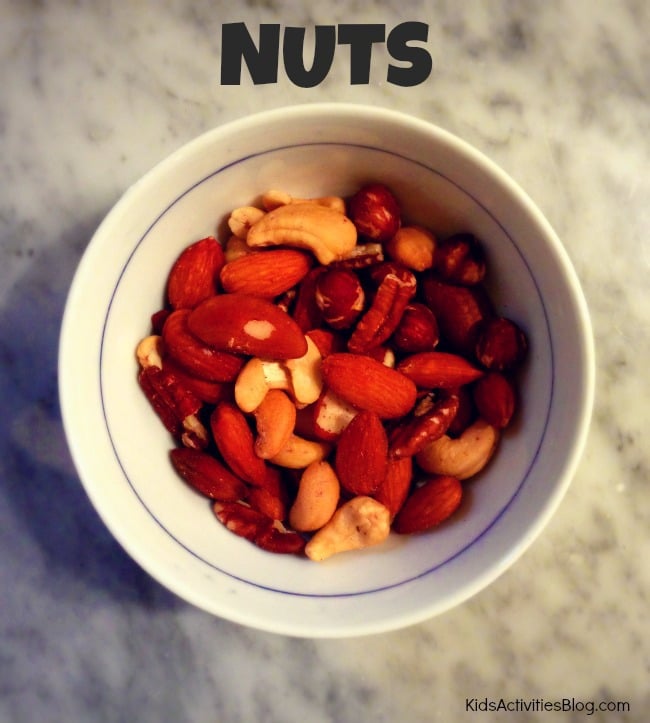 We used nuts on our first graphing exercise. I wrote the name of the nut on the paper but also placed an actual nut at the top of the column as we went through the exercise. We used a “tally system” so every fifth nut we counted we made a slash through four vertical lines. Therefore, we had some great practice counting in fives.