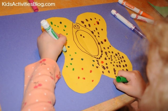 We started with just basic markers, construction paper, and scissors. ย I love activities that I can just pull supplies out of the closet. She folded a piece of construction paper lengthwise “hot dog style”. ย I drew a kind of lima bean shape on the fold of the paper. ย We talked about what a cute caterpillar this would make and my daughter couldn’t wait to cut it out. Book Activity for Far Flutterby by Karen Kingsbury {Metamorphosis} She decorated her caterpillar with stripes, an eye and a sweet smile. Metamorphosis book activity for Far Flutterby by Karen Kingsbury