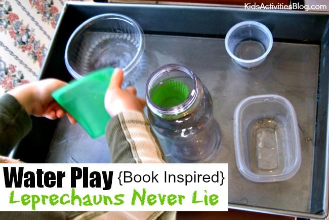 Leprechauns Never Lie is a cute book to read just in time for St Patricks Day. These water activities were book inspired from this charming story. We at Kids Activities Blog hope that your child has fun with this activity (and that you have an extra towel on hand, just in case of spills!)