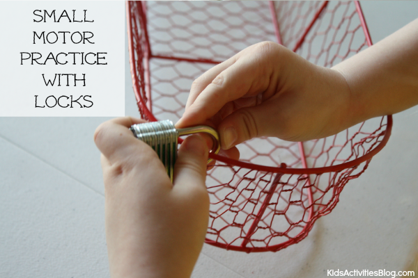 Provide a variety of keys and locks for children to practice opening. ย To simplify the guessing of which key goes with which lock, I painted part of them with corresponding colors.
