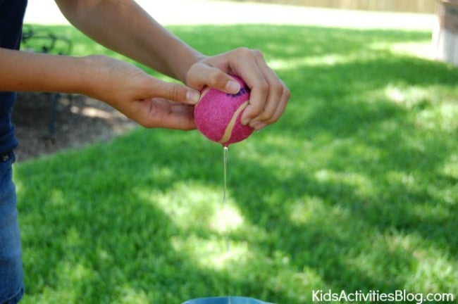 Drill a hole in a tennis ball and dunk it in a bucket full of water. Once the ball is full of water, pump it with your fist with the hole facing upwards.