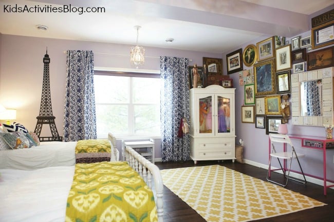Source List >> Beds: Craig’s List / Paint color = Graceful Grey by BEHR, Bedding: Target, Pillows: Target, Urban Outfitters + Home Goods, Industrial Letter ‘S’ and ‘C’: Etsy, Vintage Dresser: Ebay, Floral Rug: Target, Wall Lamps: Ikea, Chandelier: Ikea, Eifel Tower Vinyl Decal: Etsy, Curtains: Ikea, Armoire: Shabby Chic for Target, Yellow Rug: Home Goods, Desk and Chair: Ikea, Wall Color: African Violet by BEHR
