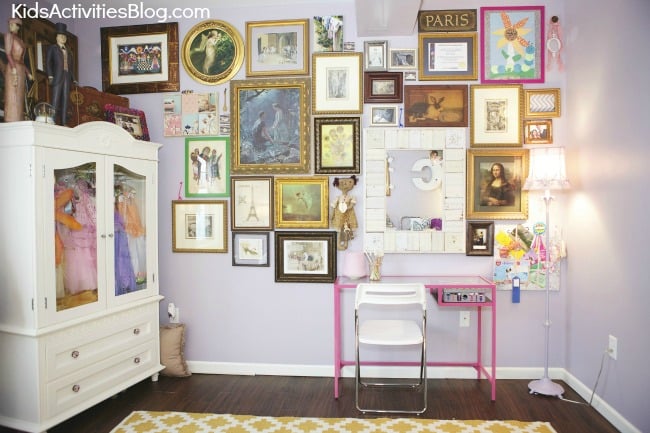 By blending newer more modern elements like an Ikea desk that we spray painted hot pink and older relics like the industrial letters from former signage that are hung above each bed, a naturally delicate balance was achieved. The shared room has a fashionable, vintage chic feel and with the oversized Eiffel Tower wall decal you can almost imagine yourself wandering the streets of Paris. Without hesitation or haste, both of my girls have settled into their new room flawlessly, which in turn makes for a very happy and inspired mommy.