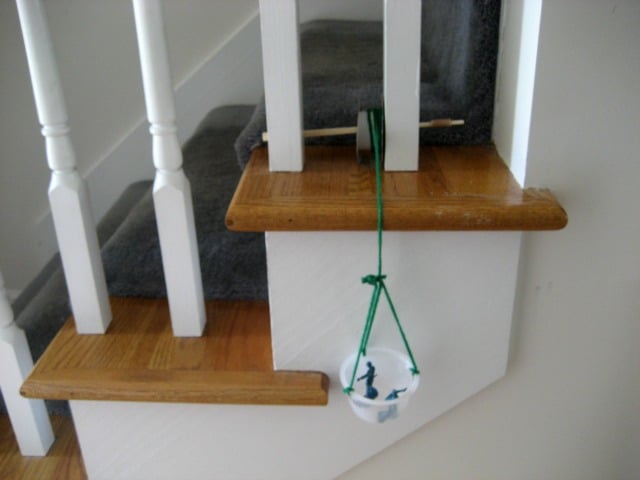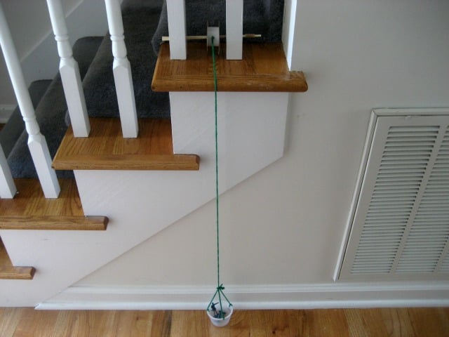 Once you have created your pulley you will need set it up in location you want to use it in. We set ours up on our stairs. The chopsticks were placed behind two sections of our Bannister. If you have headboard of a bed or chair with slats, you could set up your pulley there.