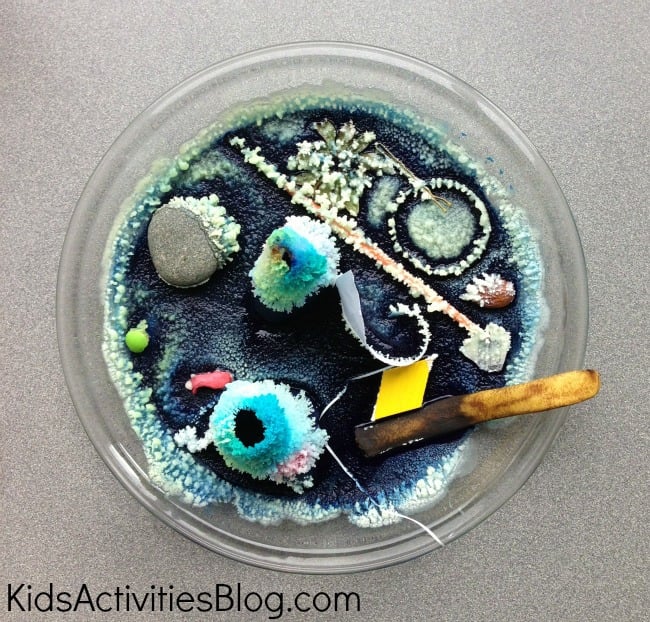 This activity you will want to start early in the day. To grow your crystal garden, you will need all day. Invite the children to add their own items to the garden and then together observe what materials work best to grow crystals and what materials do not work well.
