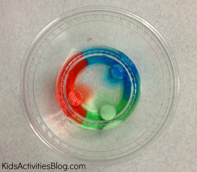 - Observe what happens as the sugar dissolves off the M&Ms and creates a solid line when the colors meet