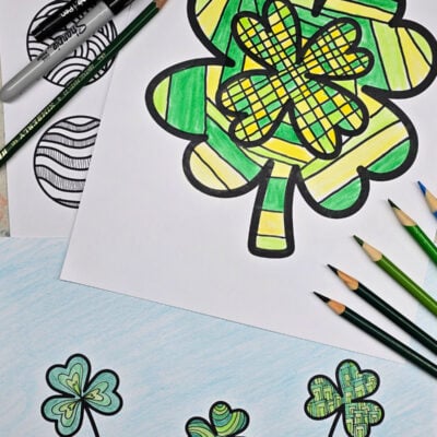 In this project, we are exploring the art of zentangle on shamrock themed coloring pages. Kids are free to relax and enjoy their unique pattern creations through the use of lines, dots, and colors.