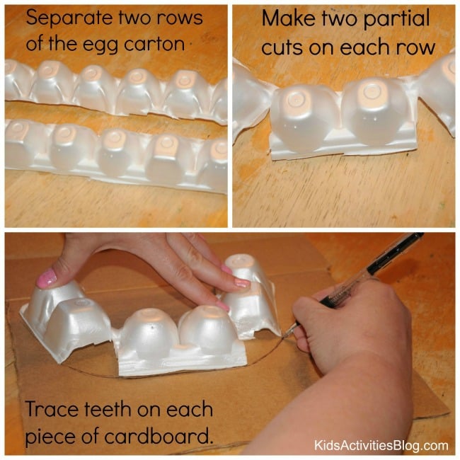 First cut the top off the egg carton and discard. Â Separate the egg cradles into two rows. Â These will be the rows of upper teeth and lower teeth.
