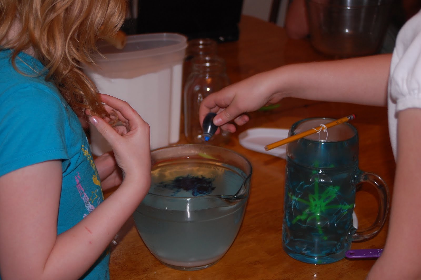 Troop Petrie created some fun and whimsical snowflakes with her kids using borax (which is a staple in homemade cleaners) and pipe cleaners. As borax is a chemical and not edible this would definitely need to be a “well-supervised” experiment. Here are