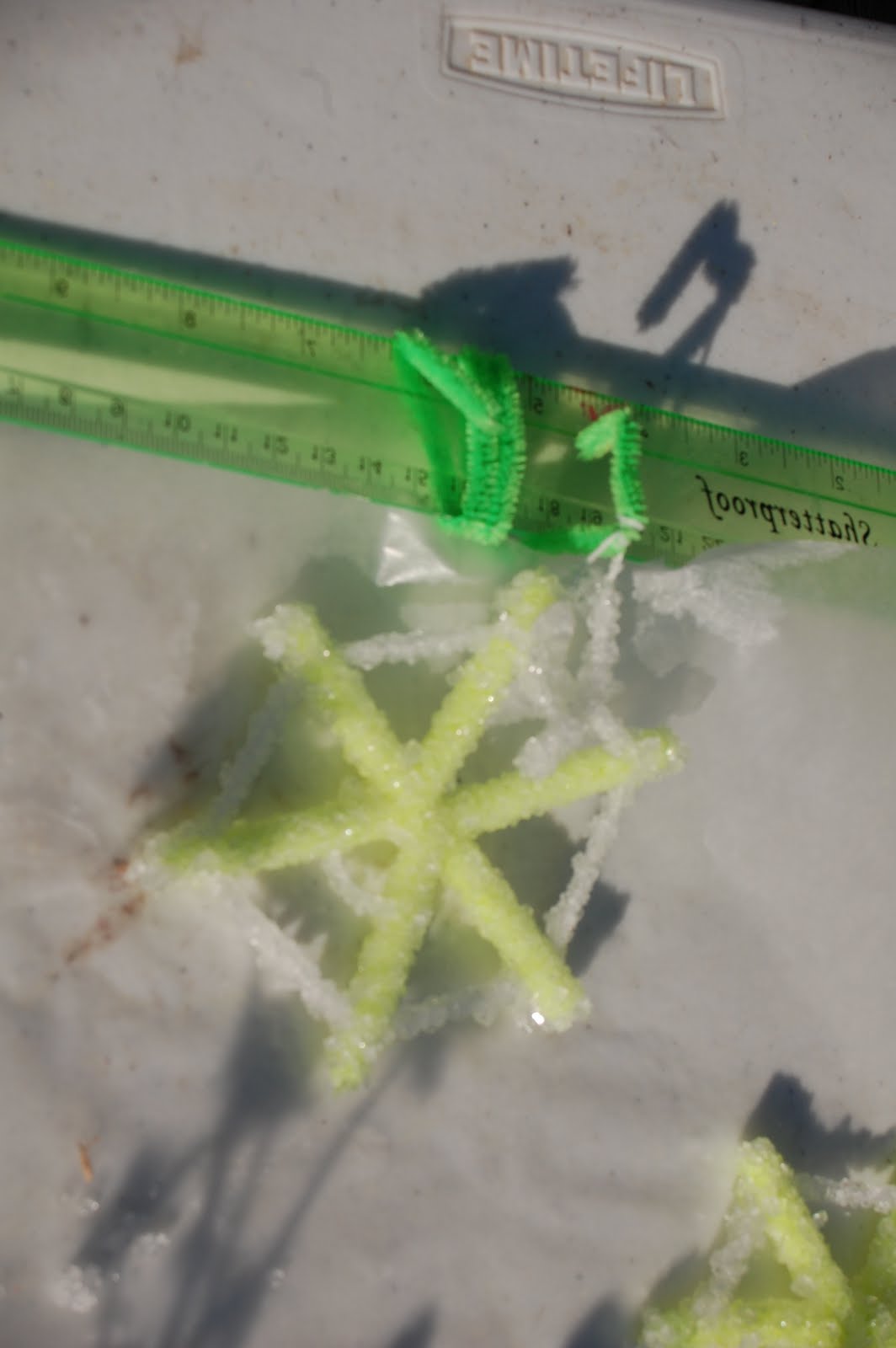 We made borax snowflakes, it was really easy and fun. We made 4 of them and gave them to grandparents when they visited. Our biggest challenge was finding a jar with a wide enough mouth. I copied the directions from about.com
