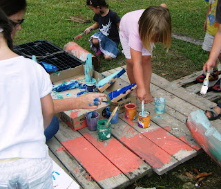 Unfortunately the wood pieces ran out before their desire to paint did. So they began to paint the wooden pallet. And then the logs.