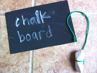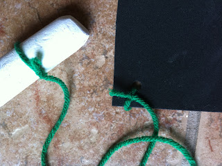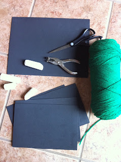 Easy peasy to make with black craft foam sheets (i cut 8×10 sheets in half), green yarn, sidewalk chalk, and a hole punch: