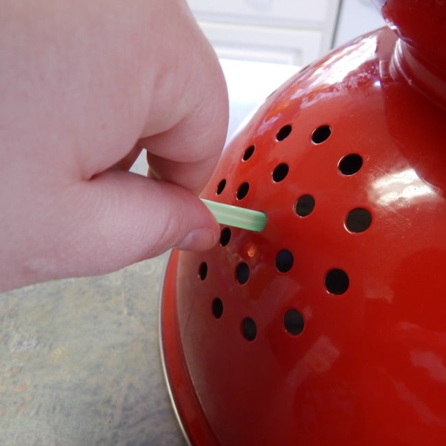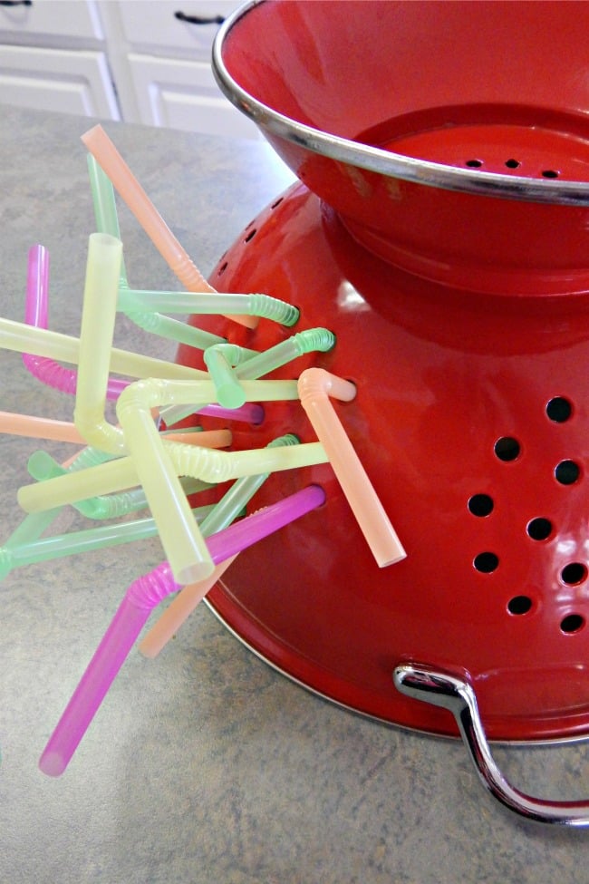 *You can substitute pipe cleaners instead of straws if your colander holes aren’t big enough for the straws or you don’t have straws on hand. If your pipe cleaners are sharp on the end, simply wrap the end with some masking tape.