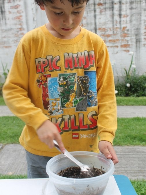 1. In a medium size bowl mix the dirt  and water. Kids love mixing so make sure you let the kiddos mix away.