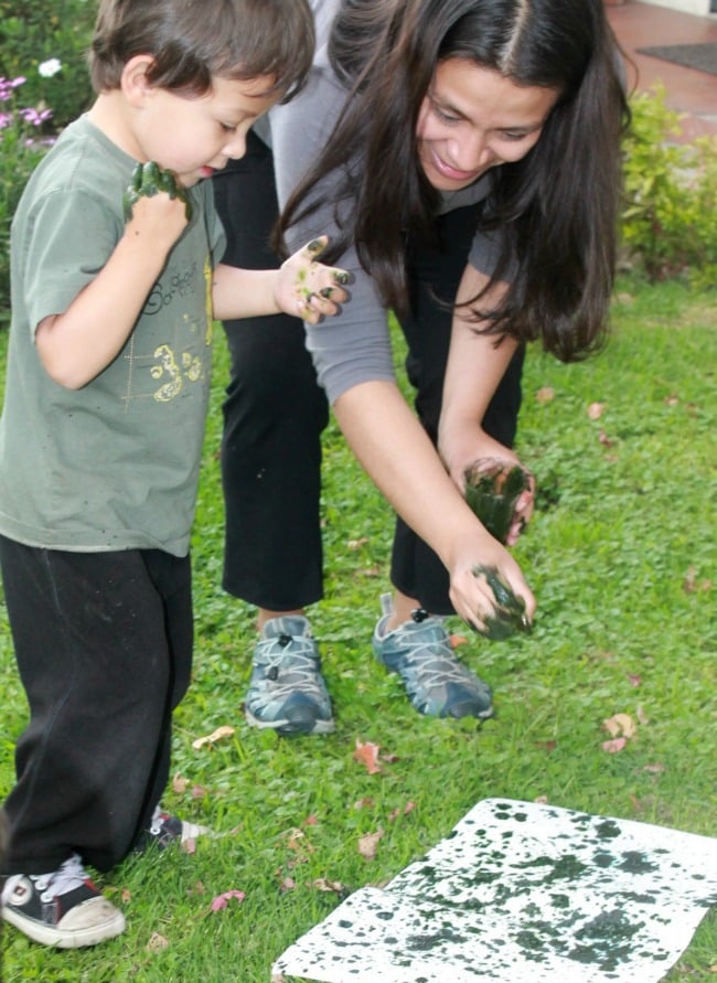 4. Mix the coloring and mud and then paint away! I didn’t want to use the normal painting utensils because I wanted my boys to have direct  contact with the mud.  It’s a great sensory activity. Feeling the cool mud sliding in your hands and running through your fingers.  So we did splash paint.  We dipped our hands in the cups of mud paint and then we splashed it onto the paper.