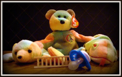 Three rainbow beanie babies – one bear, one teddy bear, and an iguana; a pacifier and a Lego ladder.