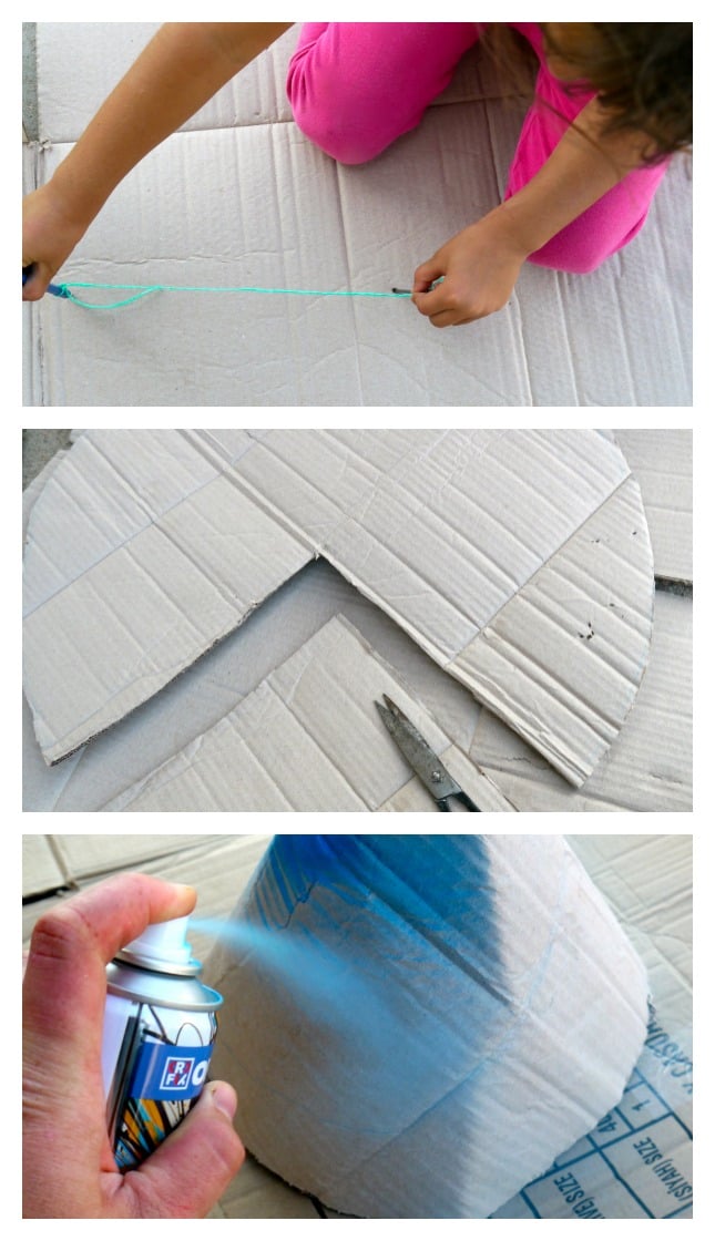 To make a big size (party hat looking) crayon tip we made a big circle on the cardboard. If you don’t have anything big and round on hand, use this trick: